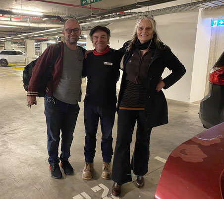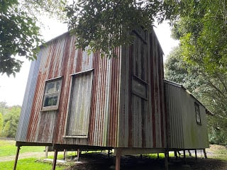 L to R - One of the beautiful sheds; & co-performers/ composers Peter Nelson; Christine Johnston; Trent Arkleysmith